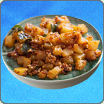 Heat oil in pan and add cumin, mustard seeds, curry leaves and asafoetida till they splutter. Add turmeric and chilli powders. Add onions till translucent.